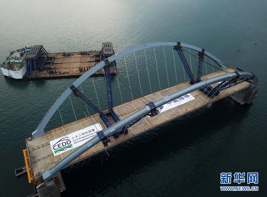 “冒出來(lái)”的并不是一座完整的大橋,而是一段跨徑長(zhǎng)達(dá)200米的雙拱鋼橋,在海面中央兀然矗立?!斑@是我們大橋工程最核心的主橋部分,技術(shù)難度最大,對(duì)整個(gè)項(xiàng)目有里程碑的意義?!背薪▎挝恢袊?guó)路橋工程有限公司董事、項(xiàng)目總指揮闞軍說。