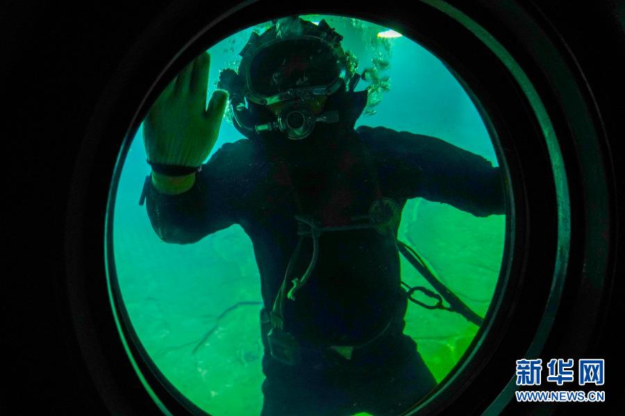 3月15日,在長(zhǎng)江水下40多米的白鶴梁題刻無(wú)壓容器罩內(nèi),潛水員在對(duì)參觀廊道的觀察窗玻璃進(jìn)行清理。新華社記者 劉潺 攝