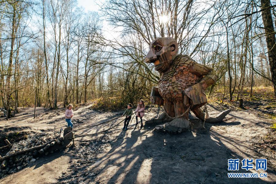 3月20日,孩子們?cè)诒壤麜r(shí)博姆市的德舒爾森林公園和一座“巨人”雕塑“玩?!薄P氯A社記者 張鋮 攝