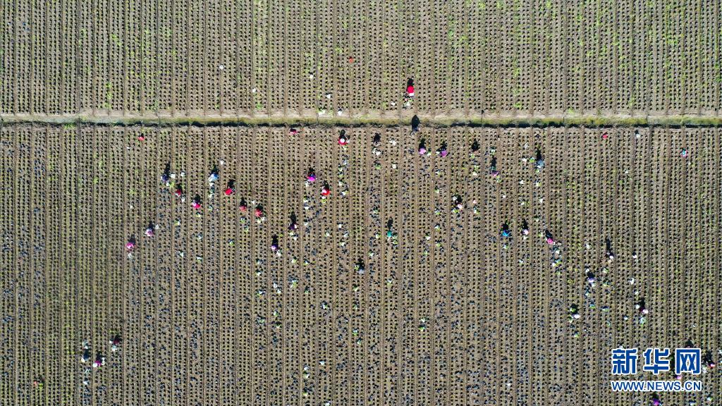 4月5日,江蘇省宿遷市沭陽(yáng)縣劉集鎮(zhèn)南長(zhǎng)莊村農(nóng)民在田間勞作(無(wú)人機(jī)照片)。