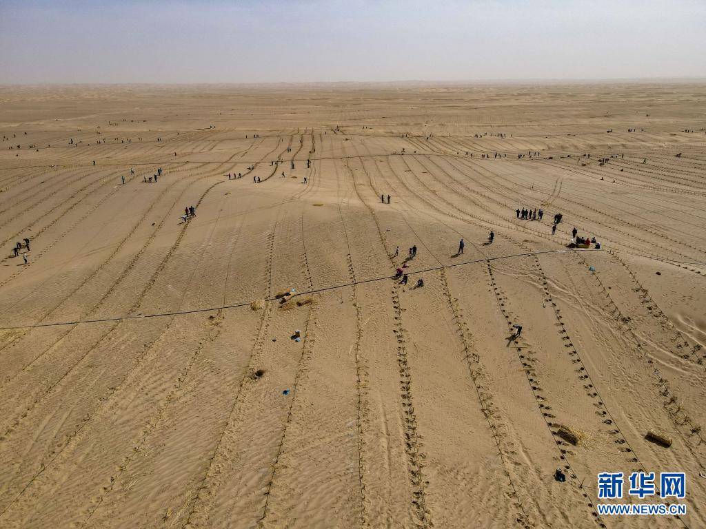 這是在新疆且末縣城不遠(yuǎn)處的塔克拉瑪干沙漠內(nèi)植樹的群眾(3月28日攝,無人機(jī)照片)。新華社記者 高晗 攝