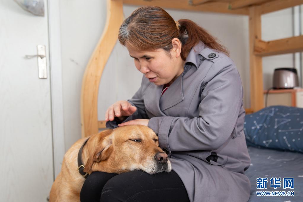 導(dǎo)盲犬“多多”經(jīng)常會把頭放在祝愛葉腿上,祝愛葉一邊撫摸著它的頭一邊和它說說心里話(4月26日攝)?! ⌒氯A社發(fā) (張夢 攝)