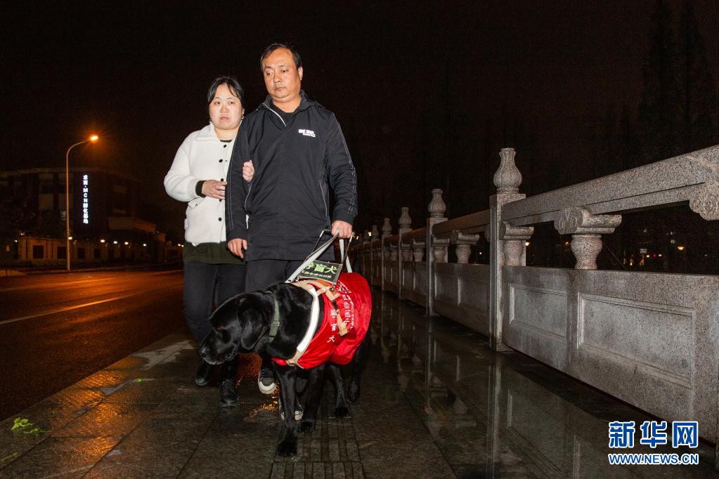 4月11日晚,妻子挽著吳虎剛,吳虎剛牽著“C羅”,共同走在下班回家的路上?! ⌒氯A社發(fā) (張夢 攝)