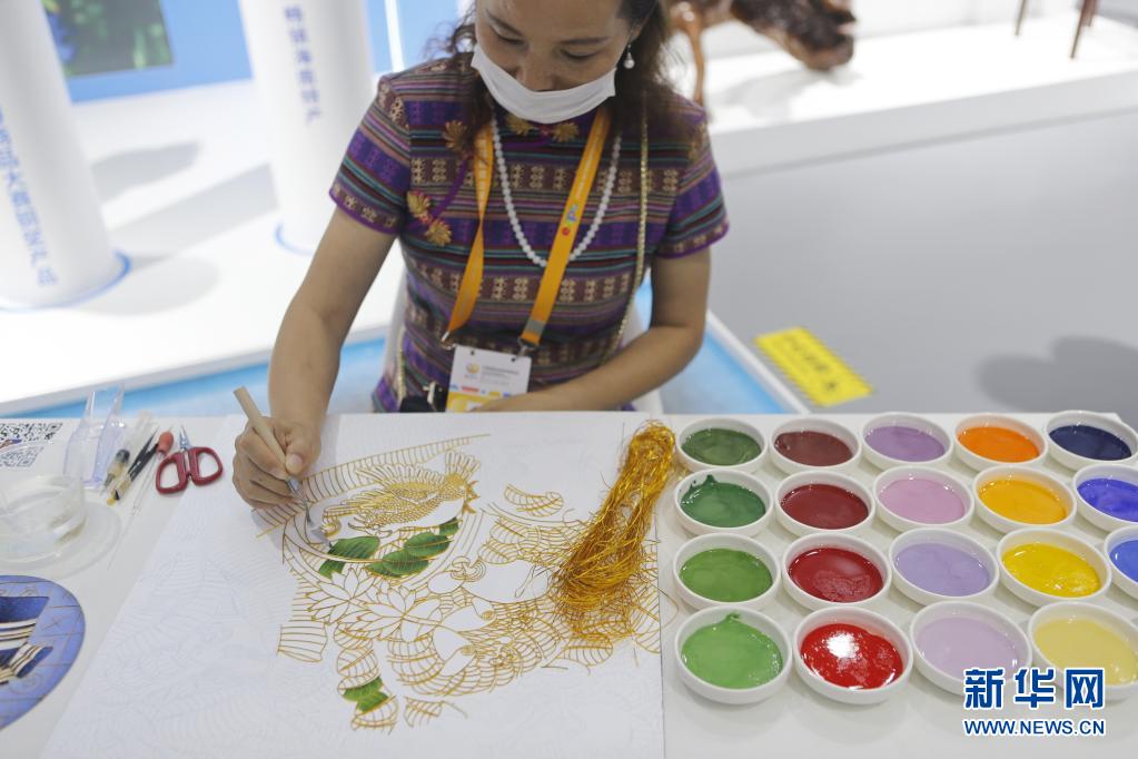 5月8日,一名參展商在消博會(huì)現(xiàn)場制作景泰藍(lán)畫。新華社記者 丁洪法 攝