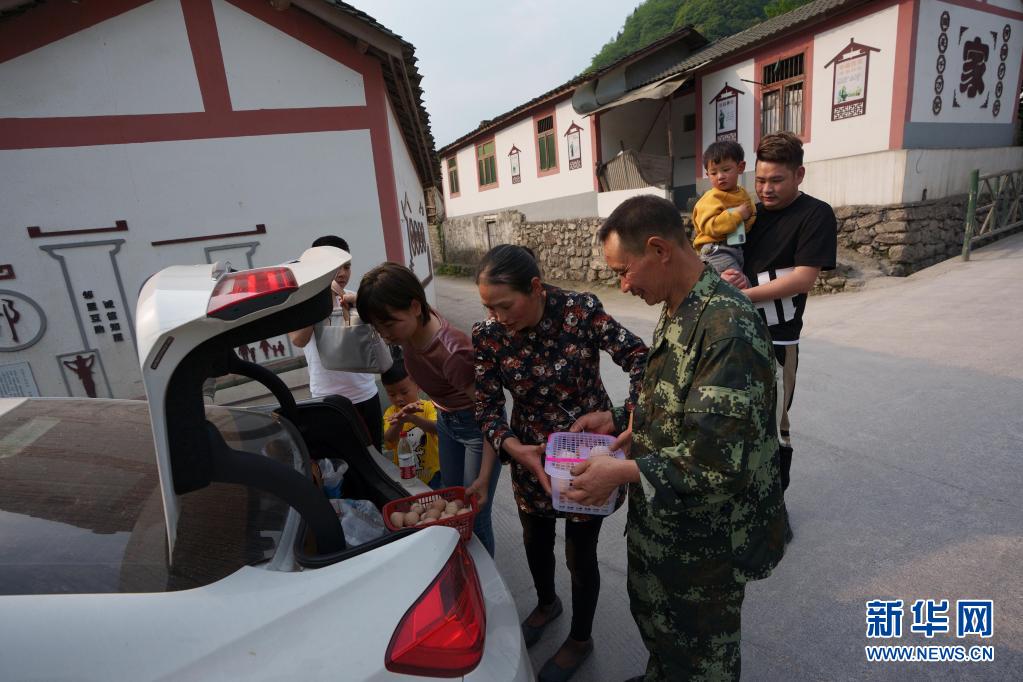 5月4日,女兒林苓一家準(zhǔn)備返程時,林興聰、李蕓香夫婦給他們捎上雞蛋。 新華社記者 江宏景 攝