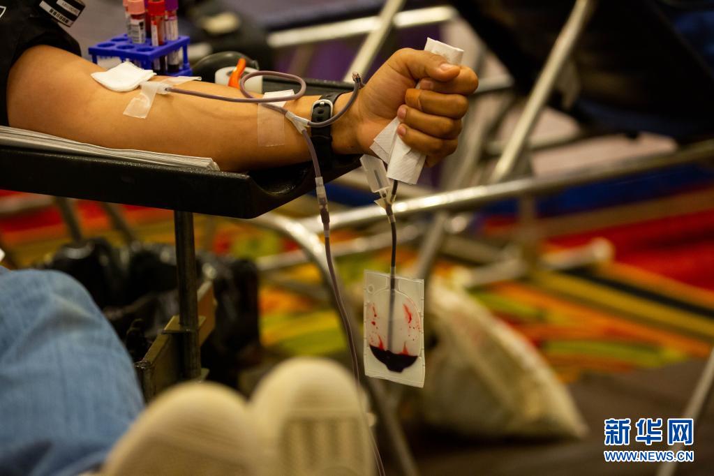 6月14日,在美國紐約州長島地區(qū)的尤寧代爾,獻血志愿者在美國紐約血液中心舉行的獻血活動上獻血。