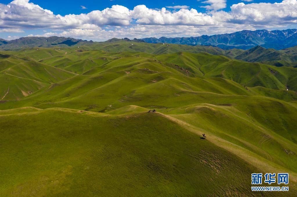 新疆裕民縣的牧民策馬奔馳在巴爾魯克山區(qū)夏牧場上(6月15日攝,無人機(jī)照片)。