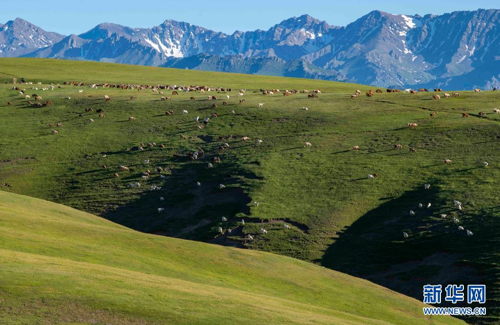 眼下,巴爾魯克山區(qū)的夏牧場(chǎng)迎來(lái)放牧黃金季。群山起伏,峰巒翠綠,氈房、牛羊等牲畜分散點(diǎn)綴其間,自駕游客時(shí)而穿梭往來(lái),共同譜寫(xiě)一曲高山夏季牧歌。