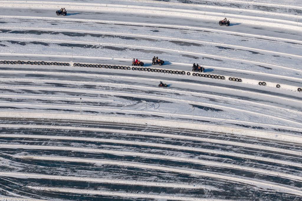 1月1日,人们在2026第八届哈尔滨松花江冰雪嘉年华园区内体验冰雪娱乐项目(无人机照片)。新华社记者 张涛 摄