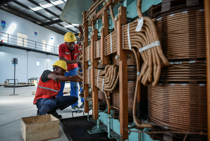 2025年3月26日,在位于赞比亚中央省奇邦博市的赞比亚江西经济合作区,工人们进行变压器设备维保作业。新华社记者 韩旭 摄