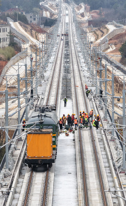 2026年1月19日,这是昌九高铁庐山南站至共青城东站区段铺轨施工现场。新华社记者 周密 摄