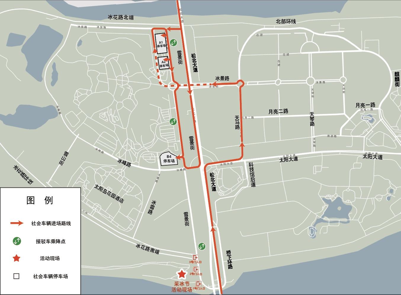 江北方向:松北大道——冰花路北端——雪景街——冰雪大世界B區(qū)停車場(乘坐接駁車前往采冰節(jié)現(xiàn)場)。