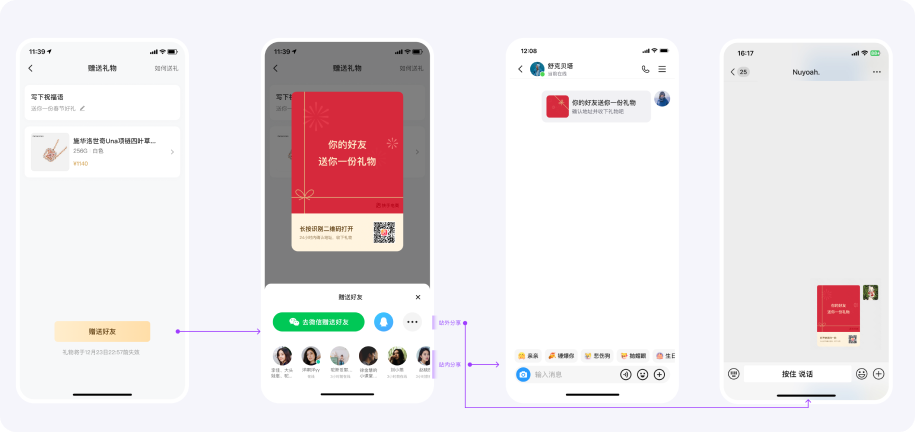 在送禮商品供給上,快手“春節(jié)不打烊”活動提供的優(yōu)質(zhì)豐富的年貨禮品,為用戶送禮提供了更多選擇空間。在送禮交互界面上,“好友送禮”功能注重營造喜慶溫馨的送禮氛圍,從界面設(shè)計到動畫效果都突出了禮物的儀式感,滿足用戶的情感需求。在用戶交互路徑中,用戶從選購禮物到完成送禮,可在快手生態(tài)內(nèi)通過私信、群聊完成閉環(huán);也可通過站外社交網(wǎng)絡(luò)的分享,吸引更多用戶參與。