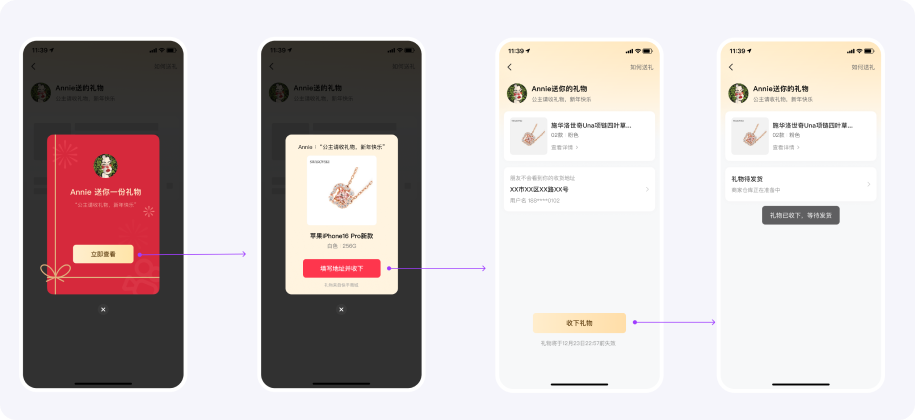 收禮人在快手、快手極速版APP完成登錄后可確認禮物內(nèi)容(包括商品信息、禮物失效時間等);在禮物領(lǐng)取頁面填寫收貨地址,并確認收下禮物后,可在對應(yīng)的禮物消息中查看禮物訂單詳情信息(具體的收貨地址對送禮人不可見)。