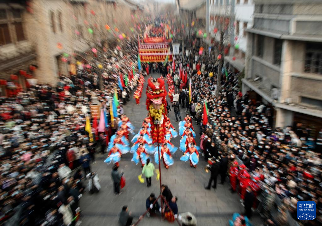 2月6日,社火团队的演员在庙会上表演舞狮(无人机照片)。