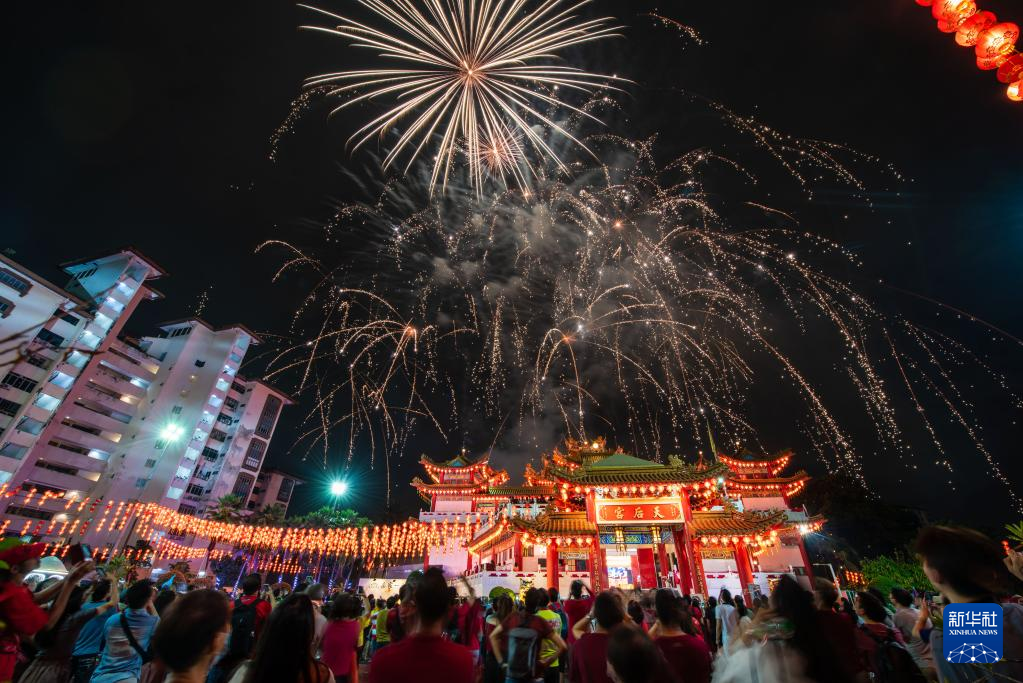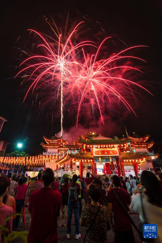 2月5日,民众在马来西亚吉隆坡天后宫观赏烟花。