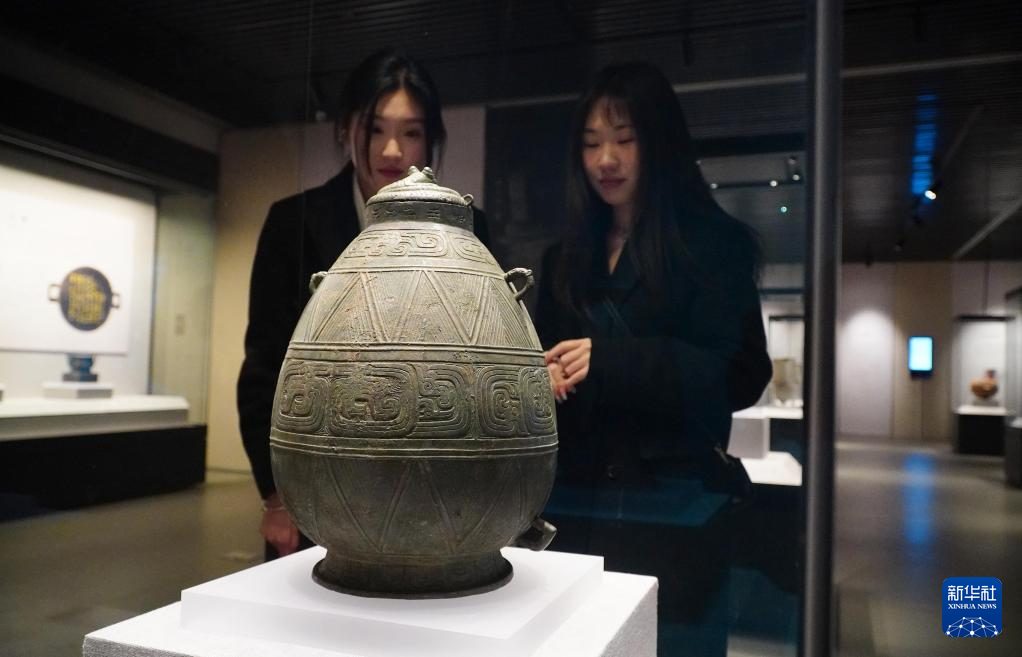 2月9日,在孔子博物馆举行的山东文物精品展上,参观者在观看孔子博物馆收藏的西周青铜器侯母壶。