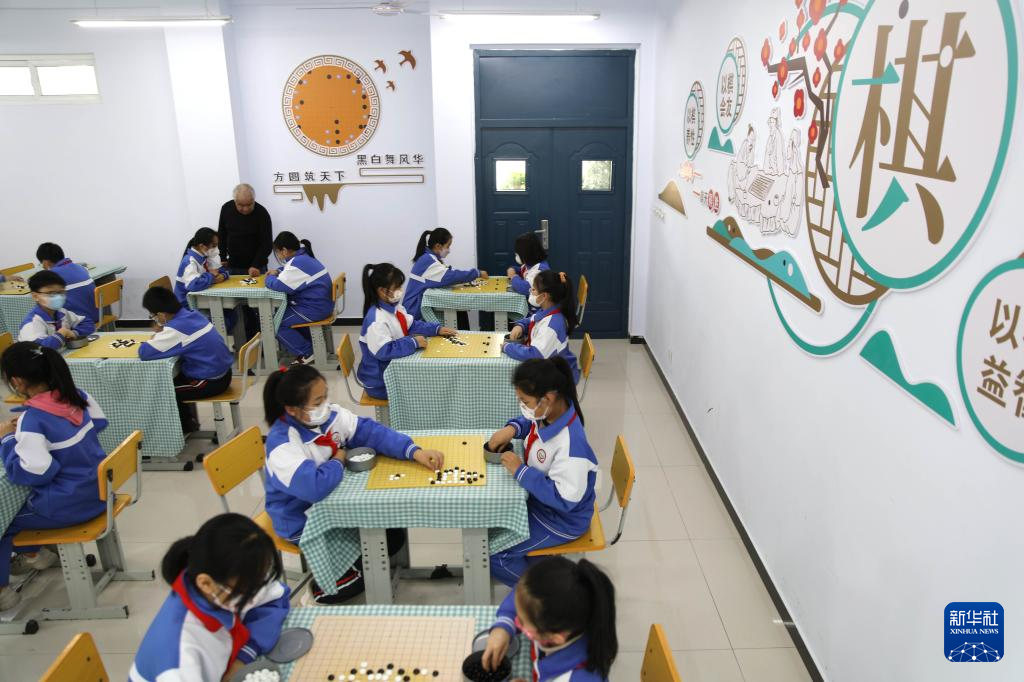 2月14日,在承德市双桥区石洞子沟小学,学生在老师的指导下学习围棋。