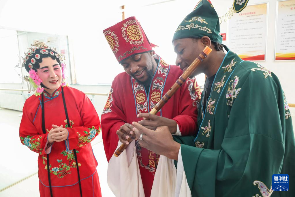2月17日,在山东省临沂市兰山区枣园镇弦子戏非遗展厅,外国留学生在民间艺人的指导下体验二胡演奏。