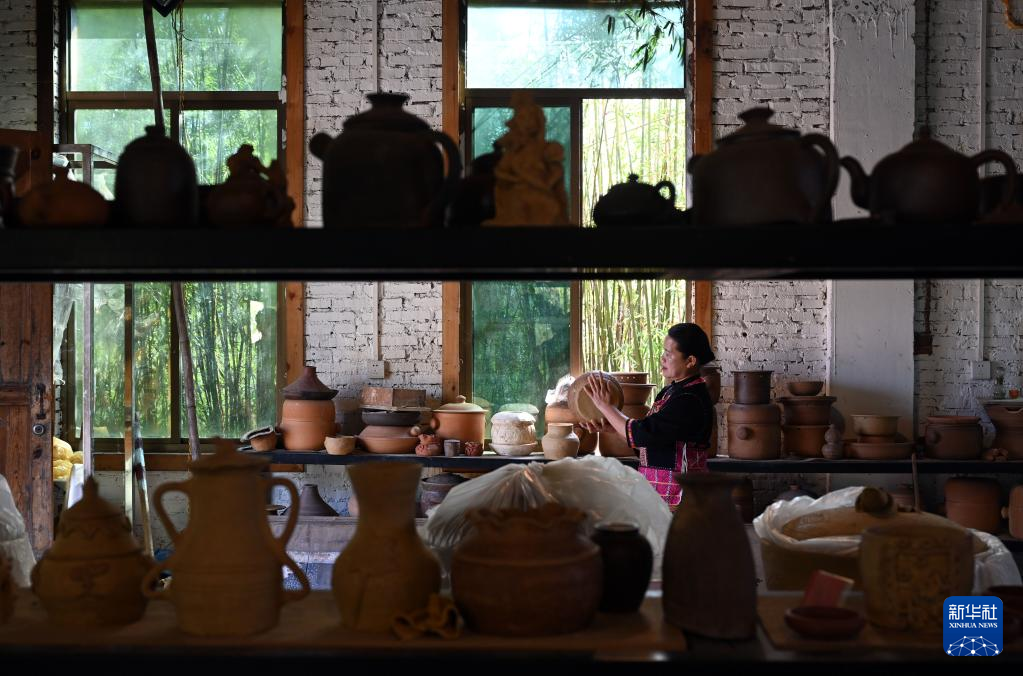2月18日,刘梅珍在海南昌江石碌镇保突村非遗黎族制陶馆擦拭陶器。