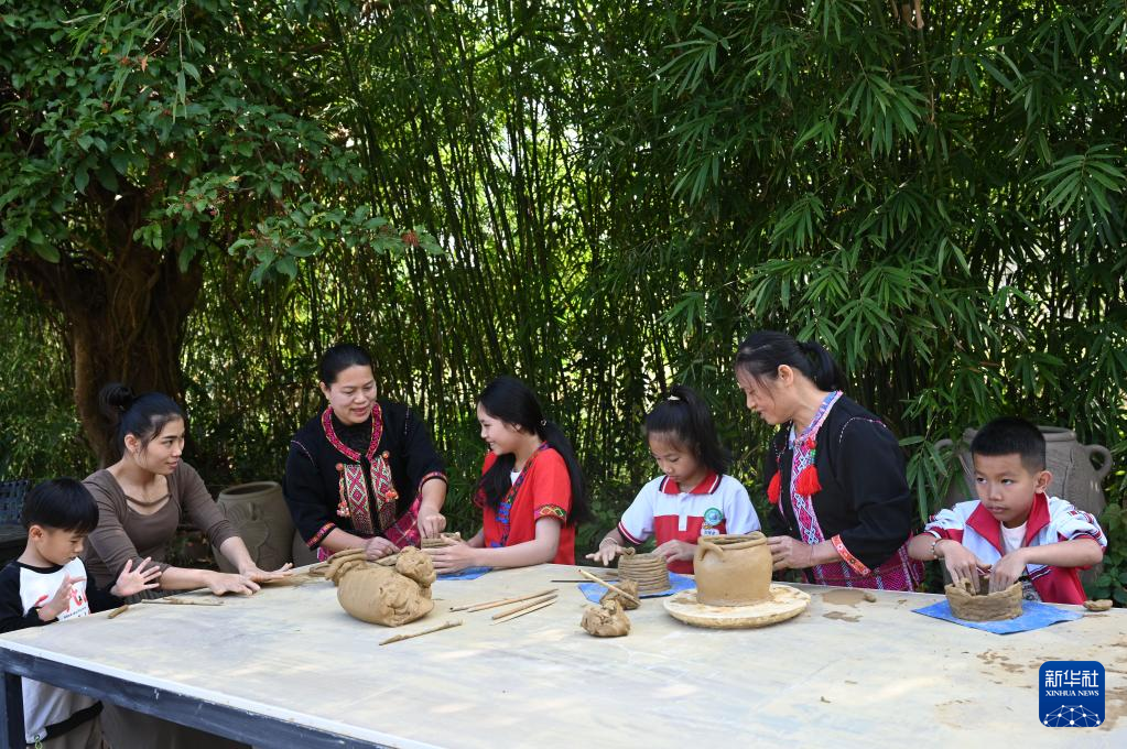 2月18日,在海南昌江石碌镇保突村非遗黎族制陶馆,刘梅珍(左三)指导前来研学的孩子们制作陶器。