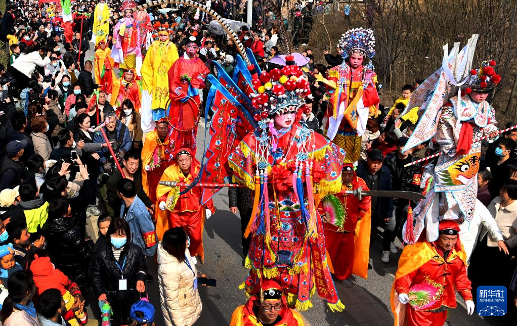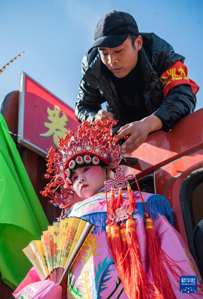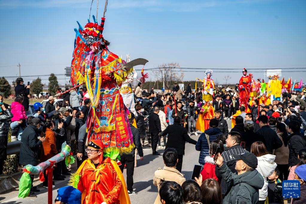 2月19日,西安市临潼区栎阳街道卷子村村民在村头巡回表演“背芯子”。
