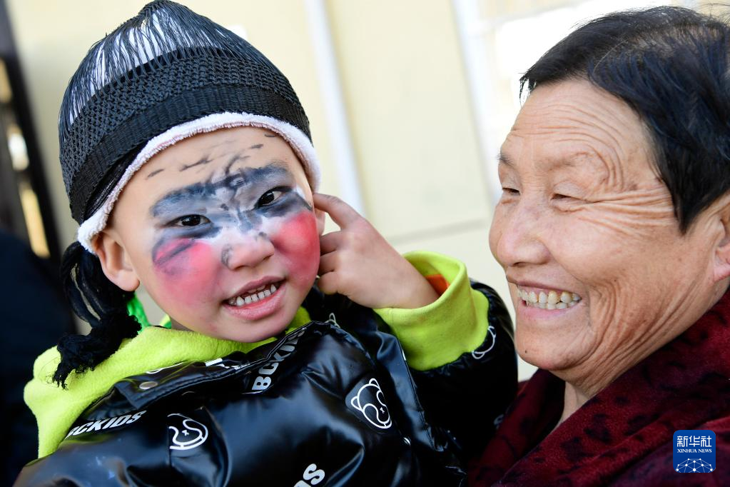 2月19日,西安市临潼区栎阳街道卷子村参加“背芯子”表演的小朋友向奶奶展示自己的妆扮。