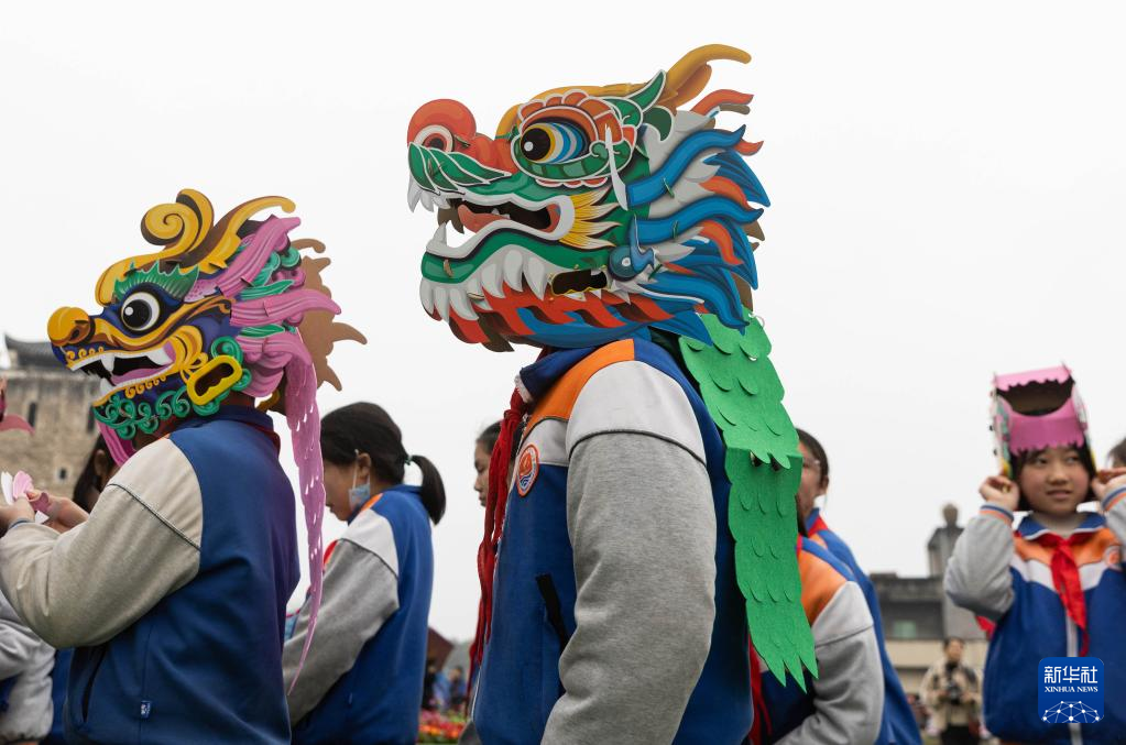 2月21日,在泸县屈氏庄园,泸县方洞小学的学生们头戴“纸龙”观看舞龙表演。