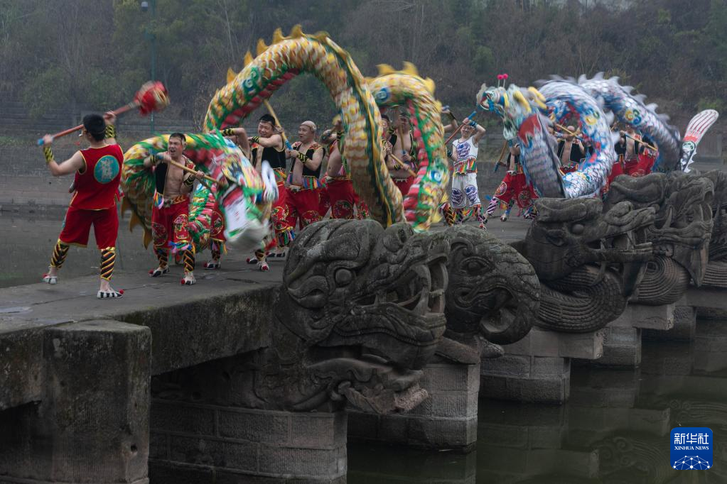 2月21日,在全国重点文物保护单位——泸县龙脑桥上,国家级非物质文化遗产“雨坛彩龙”正在表演中。