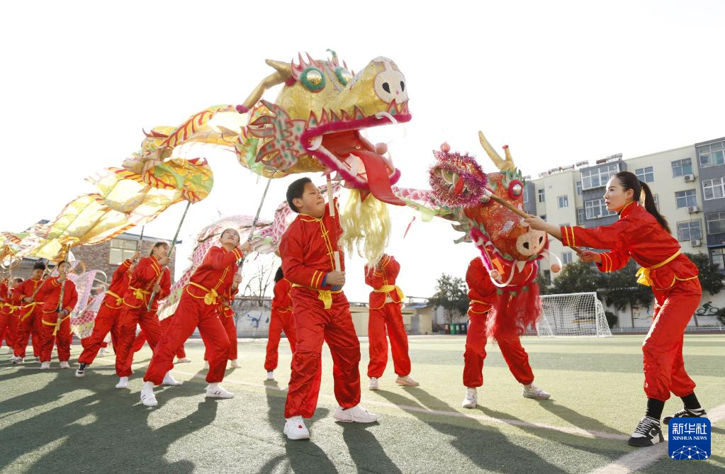 2月21日,河北省邢台市东牛角小学学生在表演舞龙。
