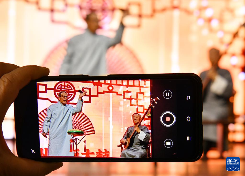 2月22日,在沧州铁狮与旧城遗址公园,游客用手机记录木板大鼓艺人演出。