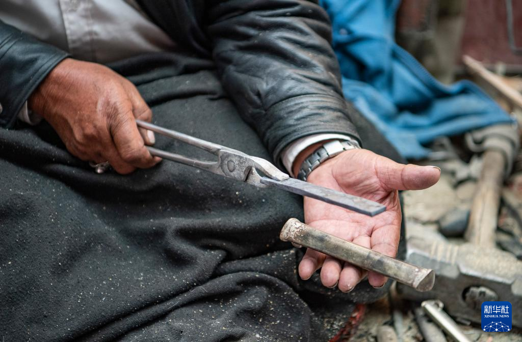 在拉孜县柳乡孜龙村,次旦旺加在制作藏刀(3月10日摄)。