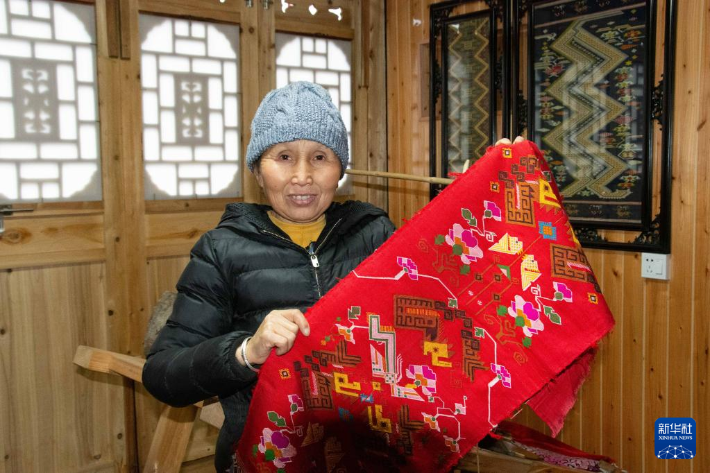 2022年1月7日,土家织锦国家级非遗传承人刘代娥在湖南省龙山县苗儿滩镇捞车村展示自己做的土家织锦。新华社记者 柳王敏 摄