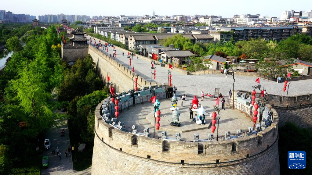 游客在西安城墙参观游览(4月30日摄,无人机照片)。