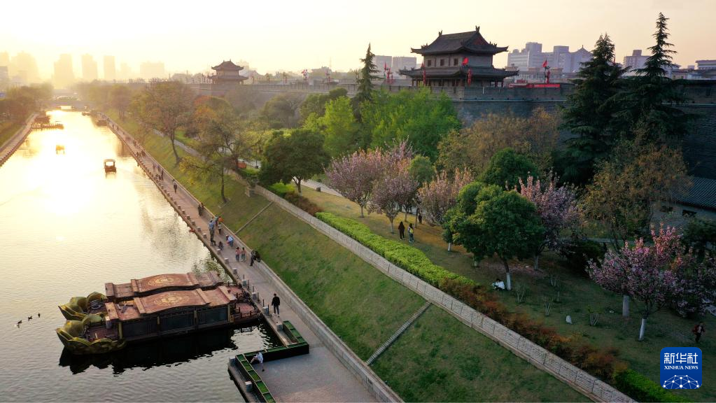 西安城墙西侧护城河(4月15日摄,无人机照片)。