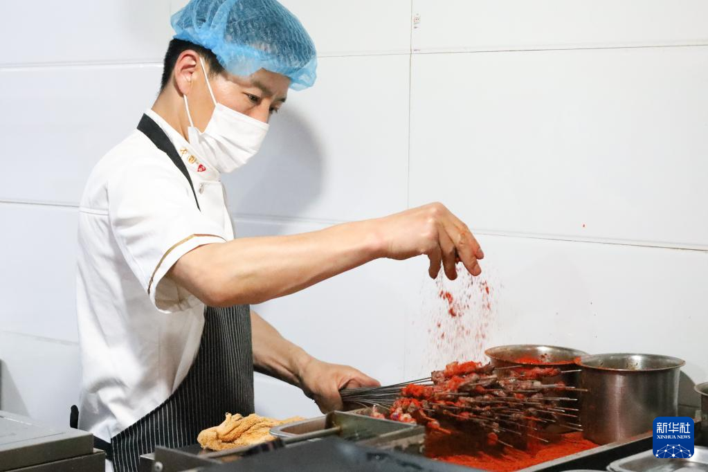 5月12日,在嘉峪关市的一家烤肉店,厨师正在烤肉。