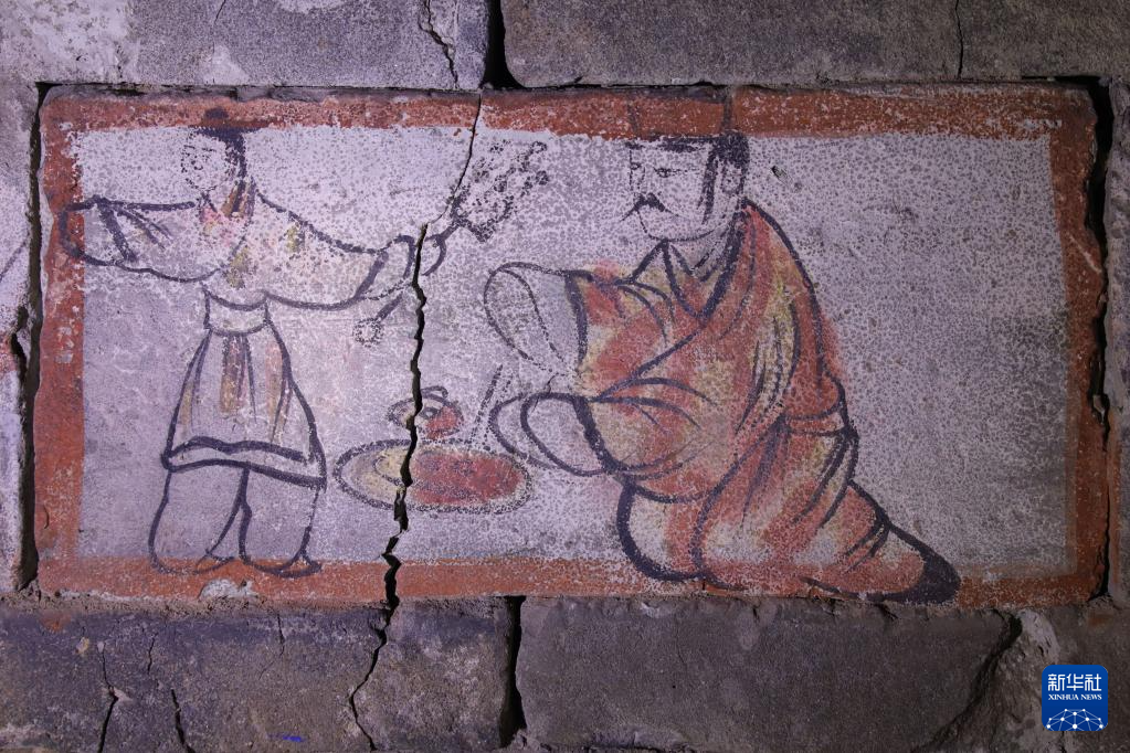 在嘉峪关魏晋墓六号墓的画像砖上,仆人(左)拿着烤肉递给衣着华丽的男主人享用(5月13日摄)。