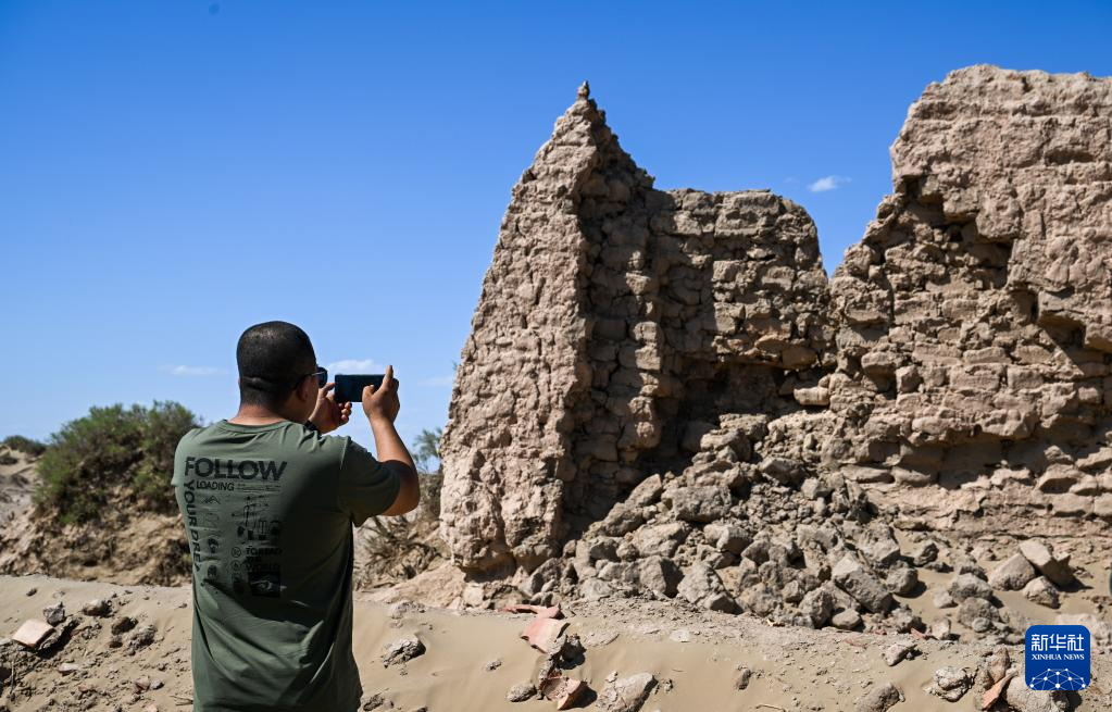 6月2日,额济纳旗文物保护中心工作人员拍摄红庙遗址坍塌情况。