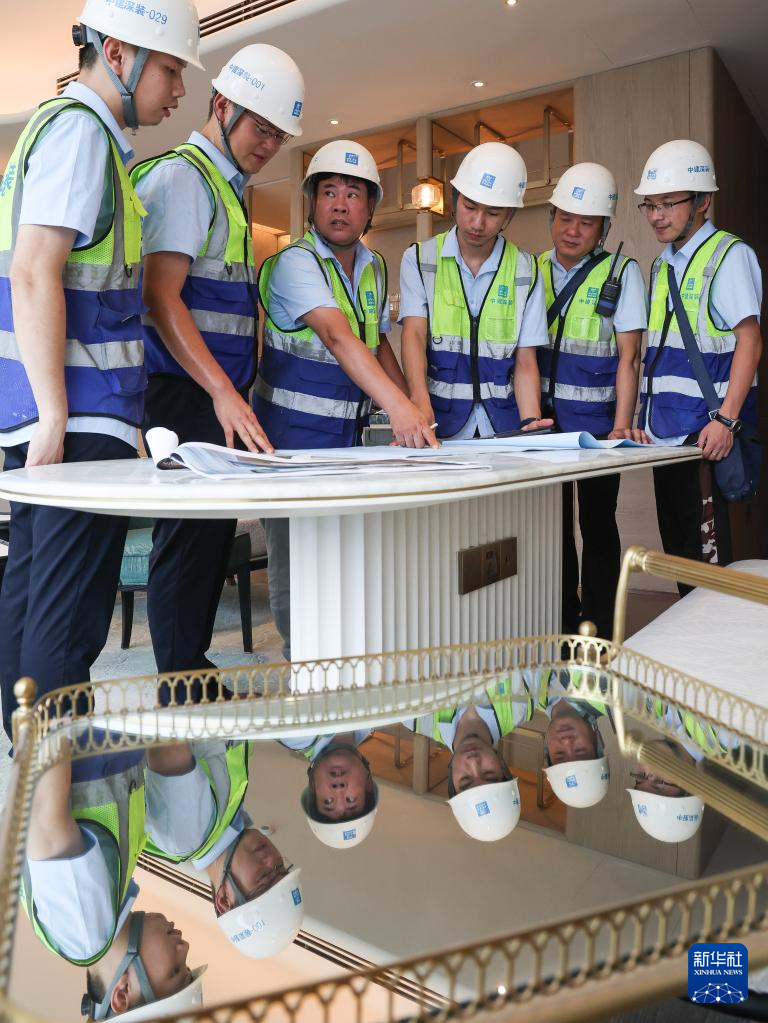 伍涛(中)和同事在项目部研究装饰施工效果和设计方案还原程度(6月26日摄)。