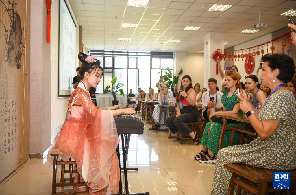 乌鲁木齐古筝爱好者在新疆图书馆为外国歌舞团演员演奏《渔舟唱晚》(7月23日摄)。