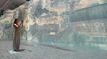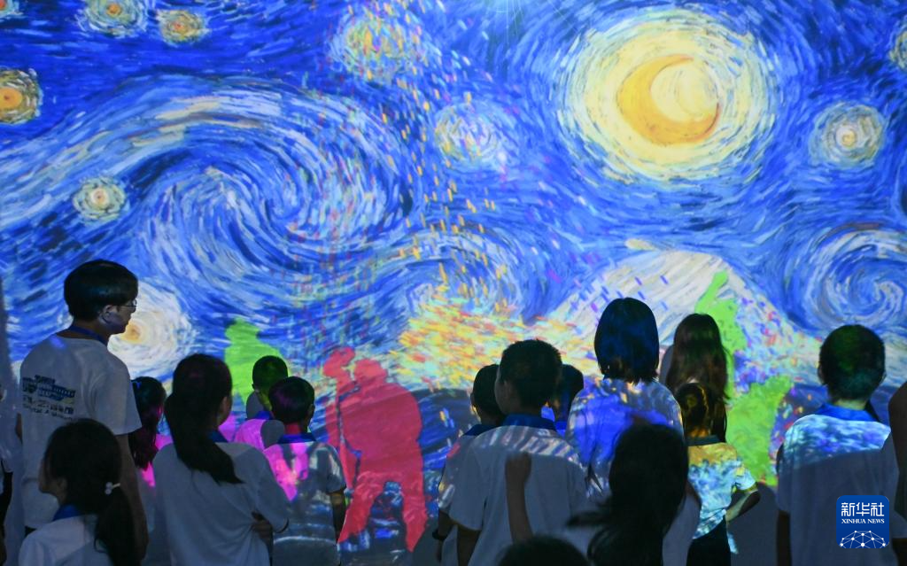 7月30日,在天津数字艺术博物馆,学生们沉浸式参观艺术作品。