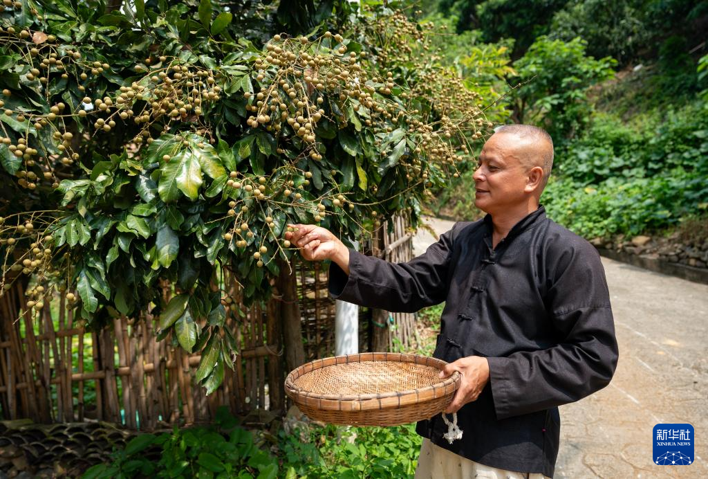 7月30日,一名坡芽村壮族村民在村子里摘龙眼。