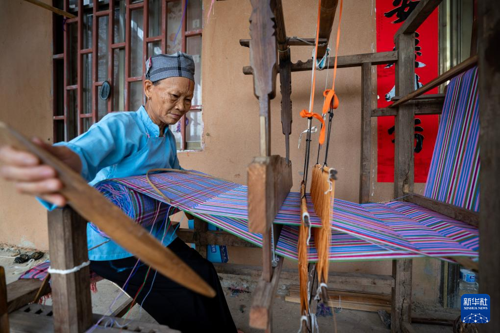 7月30日,一名坡芽村壮族村民在使用织布机织壮锦。