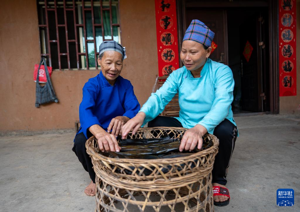 7月30日,两名坡芽村壮族村民在自家院子里晾刚制作好的壮族美食褡裢粑。