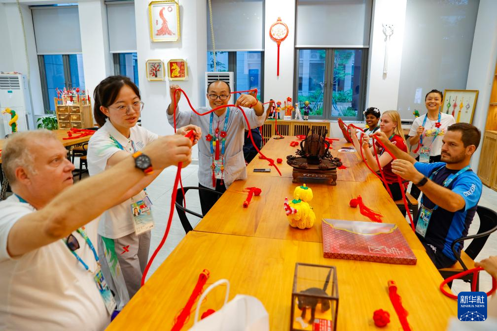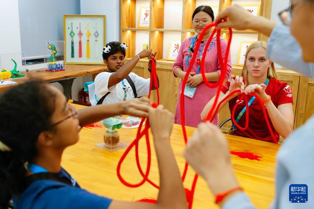 7月31日,在成都大运村,几名外国代表团成员学习制作中国结。