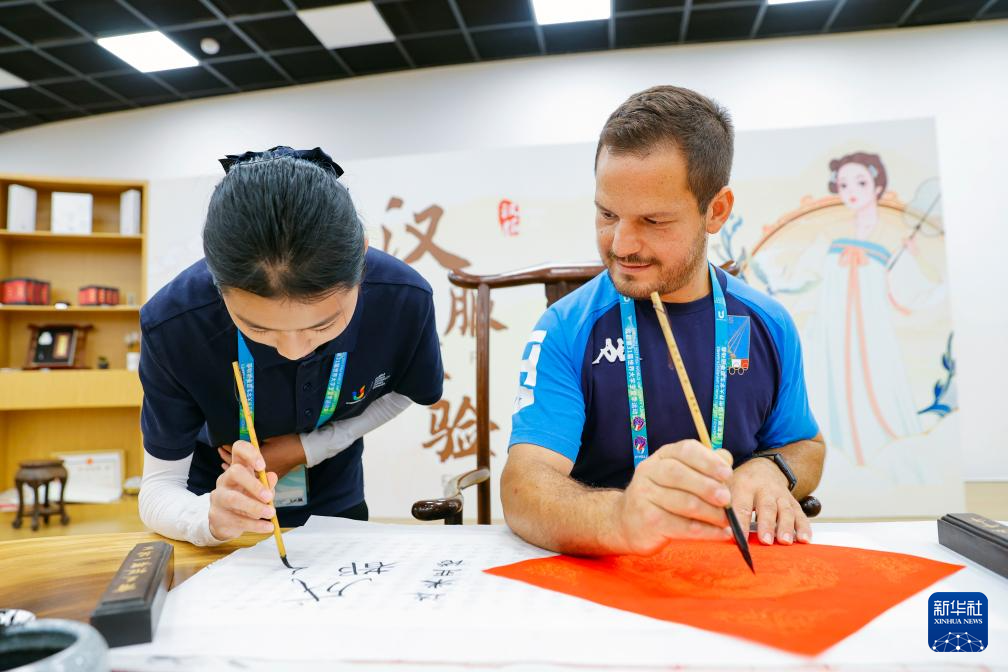 成都大运村里设置了书法、国画、蜀绣、传统乐器等丰富多彩的中国文化互动体验项目。运动员和教练员在休息之时,纷纷前来感受中国文化的魅力,了解学习中国文化。