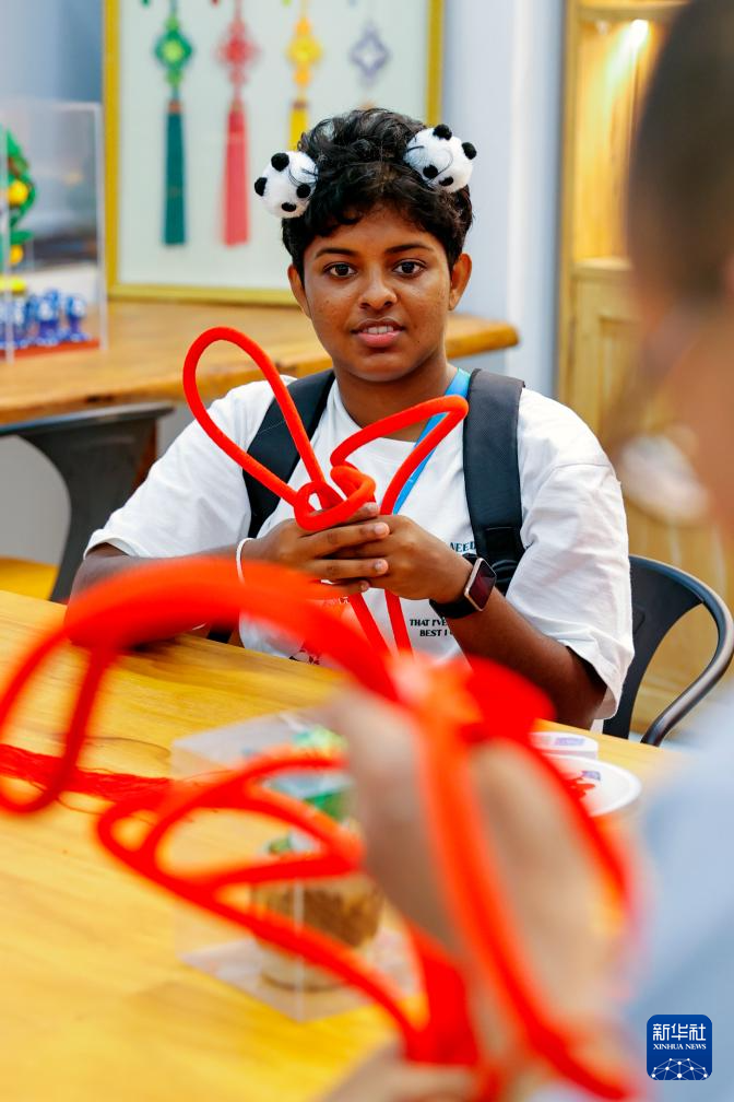 7月31日,在成都大运村,斯里兰卡运动员哈西妮学习制作中国结。