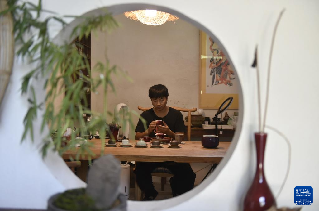 8月3日,在河南省禹州市神垕镇槐树湾村陶瓷创客基地,钧瓷艺人杨根成在自己的工作室里创作钧瓷作品。