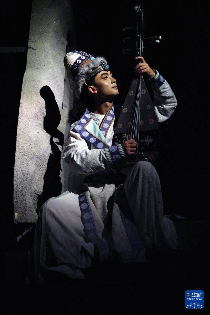 8月9日,在《乐动敦煌》演出现场,敦煌古乐全球推广大使、国乐艺术家方锦龙演奏琵琶,为舞蹈演员伴奏。