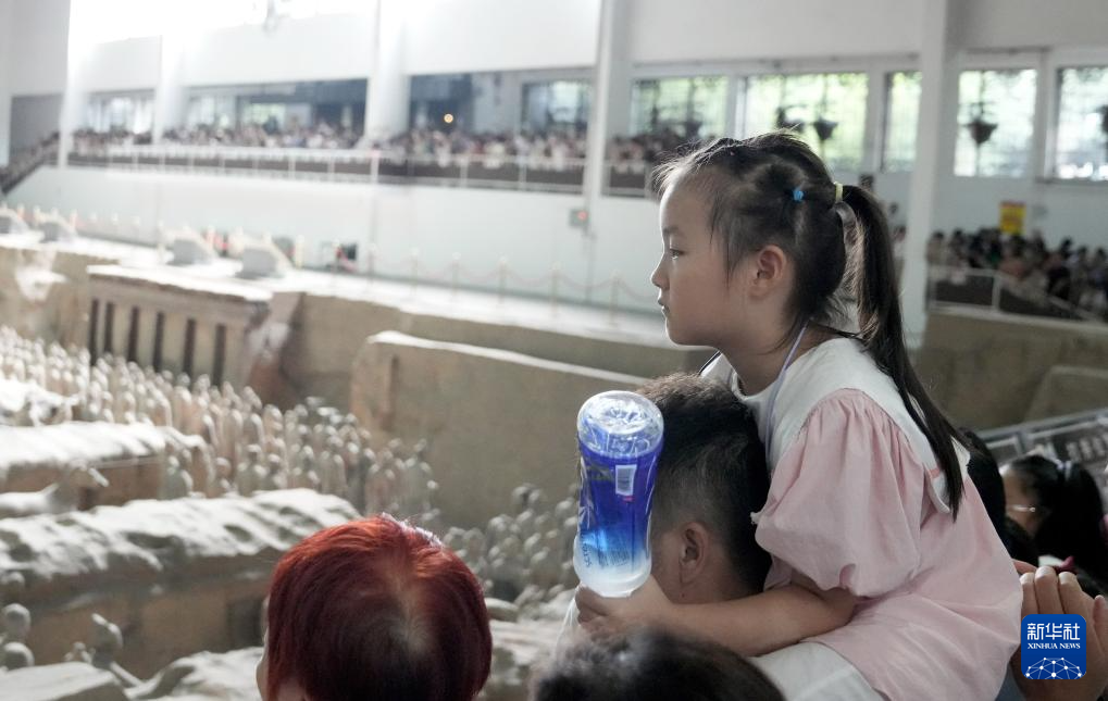 8月23日,一名小游客骑在家人肩上参观秦始皇兵马俑博物馆。